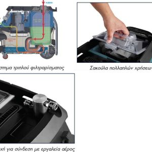 Νέας Τεχνολογίας με σύστημα τριπλού φιλτραρίσματος. (Σακούλα – πρώτο στάδιο, Φιλτράρισμα με νερό – δεύτερο στάδιο, Φίλτρο HEPA – τρίτο στάδιο).
